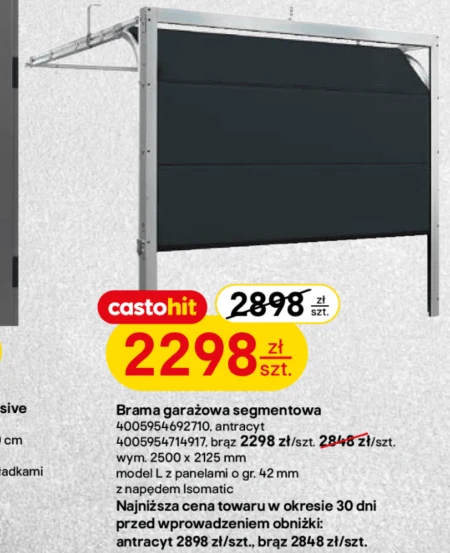 Brama garażowa segmentowa 4005954692710, antracyt 4005954714917, brąz 2298 zł/szt. wym. 2500 x 2125 mm model L z panelami o gr. 42 mm z napędem Isomatic Najniższa cena towaru w okresie 30 dni przed wprowadzeniem obniżki: antracyt 2898 zł/szt., brąz 2848 zł/szt.