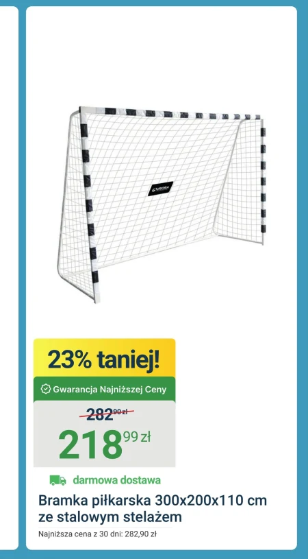 Bramka piłkarska o wymiarach 300x200x110 cm występuje w ofercie ERLI w cenie 218,99 zł, obniżonej o 23% z 282,90 zł, z darmową dostawą. Solidna konstrukcja bramki oparta jest na stalowym stelażu, co gwarantuje jej stabilność i wytrzymałość podczas gry. To doskonały wybór do ogrodu, na boisko szkolne lub na inne otwarte przestrzenie, gdzie młodzi piłkarze mogą rozwijać swoje umiejętności. Najniższa cena z ostatnich 30 dni wynosiła 282,90 zł, więc teraz jest to wyjątkowa okazja, aby zaopatrzyć się w sprzęt do piłki nożnej w atrakcyjnej cenie. Oferta ważna od 2026-04-06 do 2026-04-12 Źródło: gazetka ERLI