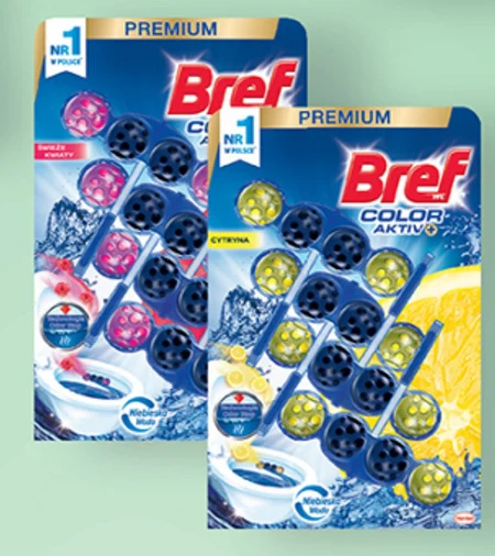 Nowy Bref Color Aktiv+ z technologią Odor Stop tworzy warstwę ochronną, która chroni przed przenikaniem nieprzyjemnych zapachów i dostarcza świeże nuty zapachowe. Dla czystej i świeżej toalety po każdym użyciu. 4 Funkcje zawieszki do muszli WC Bref Color Aktiv+ 1. Czystość pomiędzy spłukaniami dzięki mocy kulek Niebieska Woda 2. Ochrona przed osadzaniem się kamienia 3. Świeżość 4. Higiena