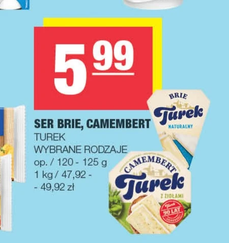 Ser Brie i Camembert Turek występują w ofercie EUROSPAR w cenie 5,99 zł za opakowanie o wadze 120-125 g, co daje cenę 1 kg w granicach 47,92 - 49,92 zł. Sery te, o delikatnym smaku i kremowej konsystencji, idealnie nadają się do podawania z pieczywem, owocami lub jako dodatek do sałatek. Wybrane rodzaje tych serów doskonale wzbogacą codzienny posiłek lub uświetnią wyjątkową okazję, stanowiąc smaczny i elegancki akcent każdej deski serów. Warto skorzystać z tej okazji, aby spróbować klasycznych smaków serów francuskich. Oferta ważna od 2026-04-08 do 2026-04-19 Źródło: gazetka EUROSPAR