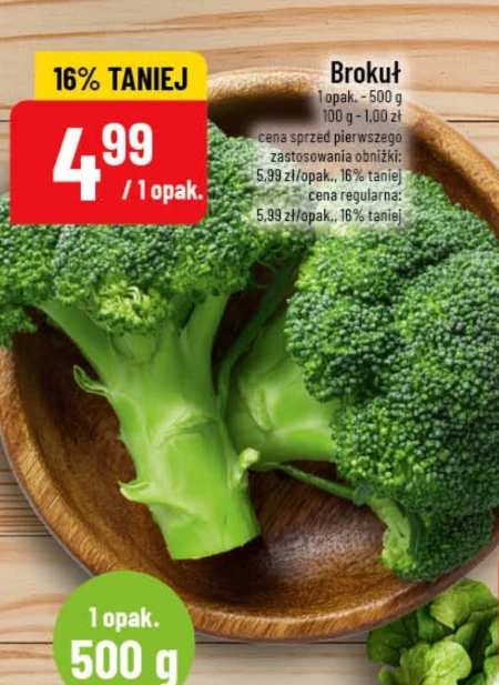 Brokuł 1 opak. - 500 g 100 g - 1,00 zł cena sprzed pierwszego zastosowania obniżki: 5,99 zł/opak., 16% taniej cena regularna: 5,99 zł/opak., 16% taniej Brokuł w promocji w POLOmarket to doskonały sposób na zdrowy posiłek. Warzywo to idealnie sprawdzi się w zupach, surówkach, a także jako dodatek do dań głównych. Aktualnie opakowanie 500g dostępne jest w obniżonej cenie, co stanowi oszczędność w porównaniu do ceny regularnej. Warto zaopatrzyć się w brokuły, aby wzbogacić dietę o witaminy i minerały.