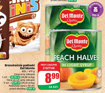 Brzoskwinie połówki Del Monte dostępne są w Dino w cenie 8,99 zł przy zakupie dwóch opakowań, waga jednego opakowania to 825 g lub 470 g, co daje cenę 19,13 zł za kilogram. Owoce te idealnie nadają się do przygotowania deserów, przekąsek, kompotów lub spożycia na surowo. Obniżka ceny z 10,99 zł na 8,99 zł przy zakupie dwóch sztuk to doskonała okazja, ponieważ najniższa cena z ostatnich trzydziestu dni wynosiła 9,85 zł. Warto skorzystać z tej oferty i zaopatrzyć się w soczyste brzoskwinie w atrakcyjnej cenie.