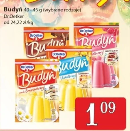 Budyn 40-45 g (wybrane rodzaje) Dr.Oetker od 24,22 zł/kg Budyn Dr.Oetker w gramaturze 40-45 g to idealny składnik do przygotowania domowych deserów, takich jak kremy, musy czy zupy owocowe. Dostępny w wybranych rodzajach, pozwala na szybkie i łatwe zagęszczenie słodkich potraw. Aktualną ofertę i różnorodność smaków znajdziesz w najnowszej gazetce PSS Zamość, gdzie budynie Dr.Oetker są dostępne dla wszystkich miłośników domowych wypieków. Możesz go wykorzystać do przygotowania ulubionych deserów dla całej rodziny.