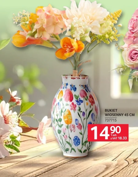 BUKIET WIOSENNY 45 CM 737715 14,90 1 szt 18,33 z VAT 18,33 Bukiet wiosenny o wysokości 45 cm to idealny sposób na wprowadzenie odrobiny świeżości do wnętrza. Aktualnie dostępny w Selgros Cash&Carry w cenie 14,90 za sztukę, co czyni go atrakcyjną propozycją w porównaniu do ceny regularnej 18,33. Można go wykorzystać jako ozdobę stołu, element dekoracyjny w salonie lub oryginalny prezent. Cena 18,33 zawiera podatek VAT.
