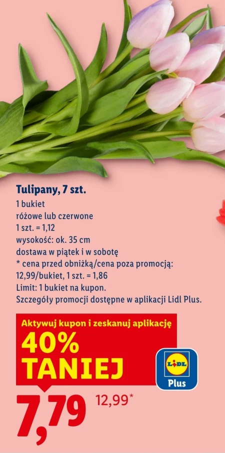 Tulipany, 7 szt. 1 bukiet różowe lub czerwone 1 szt. = 1,12 wysokość: ok. 35 cm dostawa w piątek i w sobotę * cena przed obniżką/cena poza promocją: 12,99/bukiet, 1 szt. = 1,86 Limit: 1 bukiet na kupon. Szczegóły promocji dostępne w aplikacji Lidl Plus.