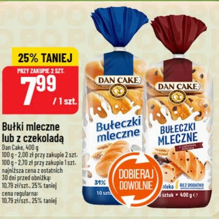 Bułki mleczne lub z czekoladą Dan Cake, 400 g 100 g - 2,00 zł przy zakupie 2 szt. 100 g - 2,70 zł przy zakupie 1 szt. najniższa cena z ostatnich 30 dni przed obniżką: 10,79 zł/szt., 25% taniej cena regularna: 10,79 zł/szt., 25% taniej
