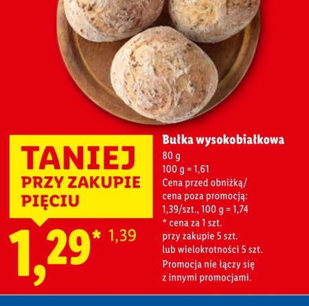 Bułka wysokobiałkowa 80 g 100 g = 1,61 Cena przed obniżką/ cena poza promocją: 1,39/szt., 100 g = 1,74 * cena za 1 szt. przy zakupie 5 szt. lub wielokrotności 5 szt. Promocja nie łączy się z innymi promocjami.