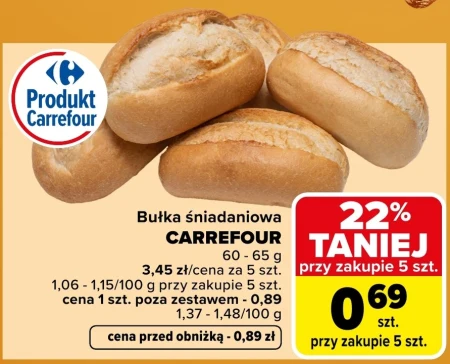 Bułka śniadaniowa CARREFOUR 60 - 65 g 3,45 zł/cena za 5 szt. 1,06 - 1,15/100 g przy zakupie 5 szt. cena 1 szt. poza zestawem - 0,89 zł 1,37 - 1,48/100 g cena przed obniżką - 0,89 zł