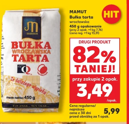 Bułka tarta Mamut wrocławska w Kauflandzie kosztuje 3,49 zł za opakowanie o gramaturze 450 g, co daje 7,76 zł za kilogram. Przy zakupie dwóch opakowań zapłacisz jeszcze mniej – drugi produkt otrzymasz z 82% zniżką. Jest to idealny składnik do przygotowania kotletów mielonych, zapiekanek czy panierowania mięs i warzyw. Regularna cena za jedno opakowanie wynosiła 5,99 zł, więc warto skorzystać z tej okazji i zaopatrzyć się w zapas.