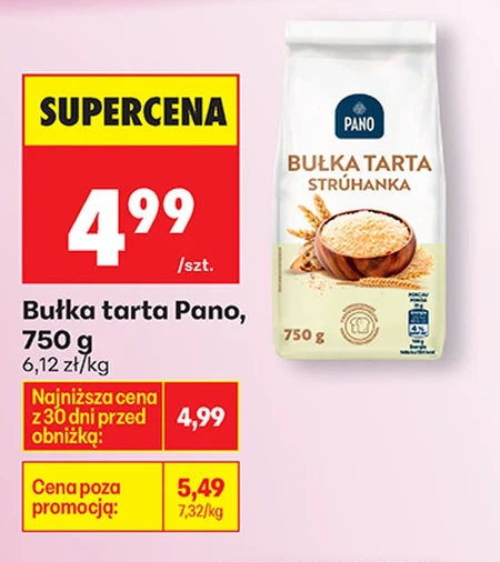 Bułka tarta Pano o wadze 750 g dostępna jest w ofercie Biedronka w super cenie 4,99 zł. To uniwersalny składnik, idealny do przygotowania kotletów mielonych, zapiekanek, panierowania mięs, ryb oraz warzyw. Dzięki niej dania zyskują chrupiącą i złotą skórkę. Obecna cena to wyjątkowa okazja, ponieważ najniższa cena z ostatnich 30 dni wynosiła 4,99 zł, a cena poza promocją to 5,49 zł.