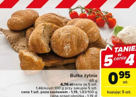 Bułka żytnia 65 g 4,76 zł/cena za 5 szt. 1,46/koszt 100 g przy zakupie 5 szt. cena 1 szt. poza zestawem - 1,19, 1,83/100 g cena przed obniżka - 1.19 zł
