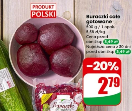 Buraczki całe gotowane 500 g / 1 opak. 5,58 zł/kg Cena przed obniżką: 3,49 zł Najniższa cena z 30 dni przed obniżką: 3,49 zł