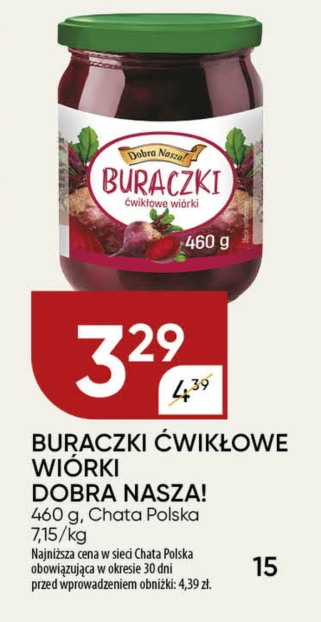 BURACZKI ĆWIKŁOWE WIÓRKI DOBRA NASZA! 460 g, Chata Polska 7,15/kg Najniższa cena w sieci Chata Polska obowiązująca w okresie 30 dni przed wprowadzeniem obniżki: 4,39 zł.