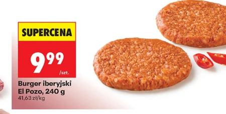 Burger iberyjski El Pozo, 240 g 41,63 zł/kg Iberyjski burger to doskonały wybór na pyszny obiad lub szybkie danie na grilla, które z pewnością zadowoli każdego miłośnika mięsa. Dzięki swoim unikalnym przyprawom i wysokiej jakości składnikom, wyróżnia się intensywnym smakiem oraz soczystością, idealną do podania w bułce z świeżymi dodatkami.