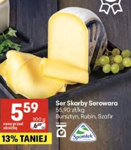 Ser Skarby Serowara dostępny jest w ofercie Delikatesy Centrum w cenie 55,90 zł za kilogram, a 100 gramów kosztuje 5,59 zł. Cena była obniżona o 13 procent z 6,49 zł. Ten wyjątkowy ser występuje w trzech smakach: Bursztyn, Rubin i Szafir, idealnie sprawdzi się jako dodatek do kanapek, składnik sałatek lub po prostu jako smaczna przekąska. Warto wykorzystać okazję i spróbować różnych wariantów tego sera. Ważność: 2026-04-02 – 2026-04-08 Źródło: gazetka Delikatesy Centrum