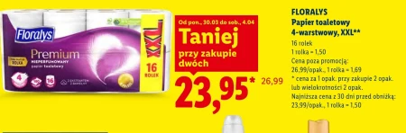Papier toaletowy FLORALYS 4-warstwowy XXL jest dostępny w ofercie Lidl w cenie 23,95 za opakowanie przy zakupie dwóch lub wielokrotności, regularnie kosztuje 26,99. Opakowanie zawiera aż 16 rolek, co zapewnia długotrwałe użytkowanie. Ten miękki i chłonny papier toaletowy zapewnia komfort i higienę dla całej rodziny. Skorzystaj z tej okazji, aby zaopatrzyć się w niezbędny produkt w korzystnej cenie i mieć zapas na dłużej.
