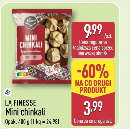 LA FINESSE Mini chinkali dostępne są w opakowaniu 400 g w cenie 9,99 zł za sztukę, a kupując drugą sztukę zapłacisz tylko 3,99 zł. To promocja, która obowiązuje na zasadzie "co drugi produkt taniej", obniżka wynosi 60%. Chinkali to tradycyjne gruzińskie pierożki, idealne na szybki obiad lub kolację, a także jako przekąska. Te małe, ręcznie lepione pierożki z delikatnym farszem mięsnym to prawdziwa uczta dla podniebienia. Można je gotować, smażyć lub piec, a ich smak najlepiej dopełniają ulubione sosy i zioła. Przygotowanie chinkali jest niezwykle proste i szybkie, co sprawia, że są świetnym wyborem dla zapracowanych osób. Promocja w Aldi pozwala spróbować tych wyjątkowych pierożków w naprawdę atrakcyjnej cenie, a druga sztuka za niecałe cztery złote to okazja, której warto się nie pozbawiać. Smak Gruzji na Twoim stole jest teraz bliżej niż kiedykolwiek. Oferta ważna od 2026-04-02 do 2026-04-04 Źródło: gazetka Aldi