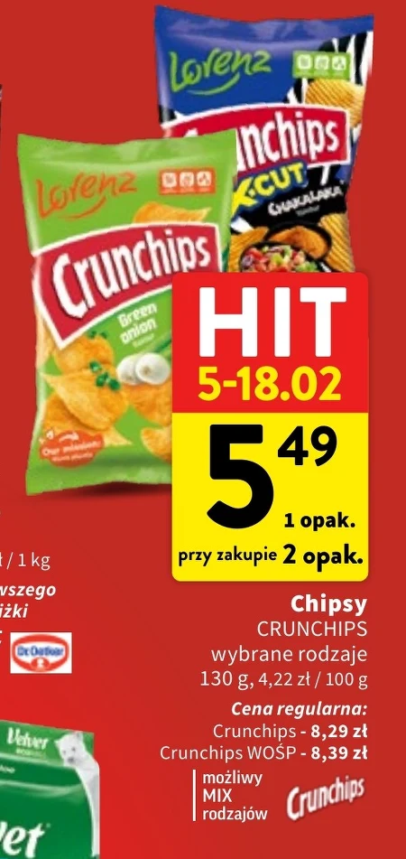 Chipsy CRUNCHIPS wybrane rodzaje 130 g, 4,22 zł / 100 g Cena regularna: Crunchips - 8,29 zł Crunchips WOŚP - 8,39 zł