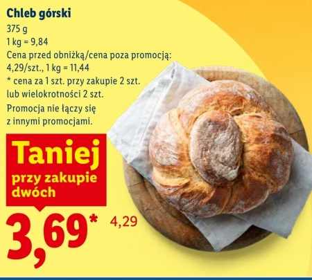 Chleb górski o wadze 375 g jest dostępny w Lidlu w cenie 3,69 za sztukę przy zakupie dwóch lub wielokrotności dwóch sztuk, co oznacza, że kilogram kosztuje 9,84 zł. Ten aromatyczny chleb doskonale sprawdzi się jako podstawa do kanapek, świetnie komponuje się z pastami i wędlinami, a także będzie smacznym dodatkiem do zupy. Warto skorzystać z tej okazji, ponieważ cena regularna tego chleba to 4,29 zł, co czyni tę ofertę wyjątkowo korzystną.