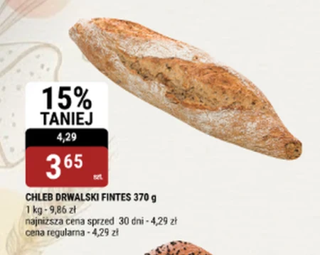 CHLEB DRWALSKI FINTES 370 g 1 kg - 9,86 zł najniższa cena sprzed 30 dni - 4,29 zł cena regularna - 4,29 zł