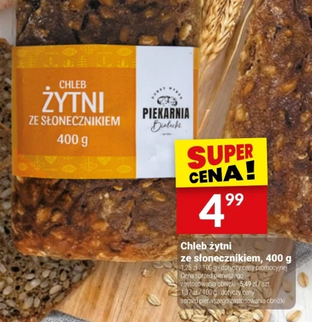 Chleb żytni ze słonecznikiem, 400 g 1,25 zł / 100 g - dotyczy ceny promocyjnej Cena sprzed pierwszego zastosowania obniżki - 5,49 zł / szt. 1,37 zł / 100 g - dotyczy ceny sprzed pierwszego zastosowania obniżki