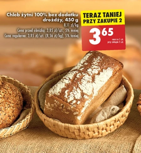 Chleb żytni 100% bez dodatku drożdży, 450 g 8,11 zł/kg Cena przed obniżką: 3,85 zł/szt., 5% mniej Cena regularna: 3,85 zł/szt. (8,56 zł/kg), 5% taniej