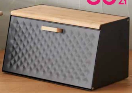 Chlebak metalowy, z bambusową pokrywką i otwieranym przodem. Wymiary: 35,5 x 21,5 x 20 cm.