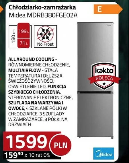 Chłodziarko-zamrażarka Midea MDRB380FGE02A ALL AROUND COOLING - RÓWNOMIERNIE CHŁODZENIE, MULTIAIRFLOW - STAŁA TEMPERATURA I DŁUŻSZA ŚWIEŻOŚĆ ŻYWNOŚCI, OŚWIETLENIE LED, FUNKCJA SZYBKIEGO CHŁODZENIA, STEROWANIE ELEKTRONICZNE, SZUFLADA NA WARZYWA I OWOCE, 4 SZKLANE PÓŁKI W CHŁODZIARCE, 3 SZUFLADY W ZAMRAŻARCE, 3 PÓŁKI NA DRZWIAC