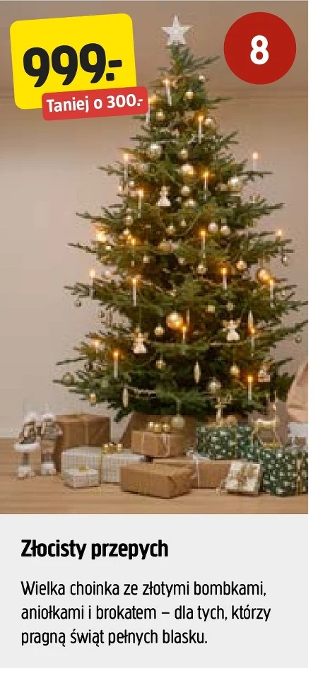 Złocisty przepych Wielka choinka ze złotymi bombkami, aniołkami i brokatem - dla tych, którzy pragną świąt pełnych blasku.