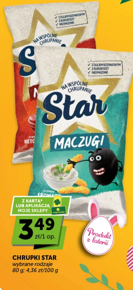 Chrupki Star w wybranych rodzajach dostępne są teraz w Moich Sklepach w cenie 3,49 zł za opakowanie. Przy zakupie z Kartą lub Aplikacją Moje Sklepy, cena za 100g to tylko 4,36 zł. Opakowanie ma wagę 80g, co sprawia, że to idealna przekąska do szkoły, pracy czy podczas oglądania filmu. Sprawdź, czy Twój ulubiony smak jest objęty tą promocją w najbliższym sklepie Moje Sklepy.