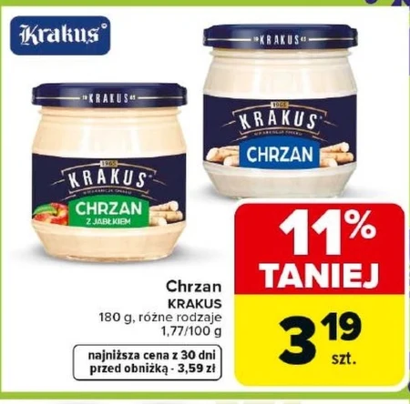 Chrzan Krakus jest dostępny w ofercie Carrefour Market w cenie 3,19 zł za sztukę, co stanowi 11% oszczędności względem ceny przed obniżką wynoszącej 3,59 zł. Produkt występuje w opakowaniach o wadze 180 g i oferowany jest w różnych rodzajach. Doskonały dodatek do mięs, wędlin, czy też składnik marynat, wzbogaci smak potraw i nada im wyrazisty aromat. Skorzystaj z obniżonej ceny i dodaj pikantny akcent do swoich kulinarnych eksperymentów.