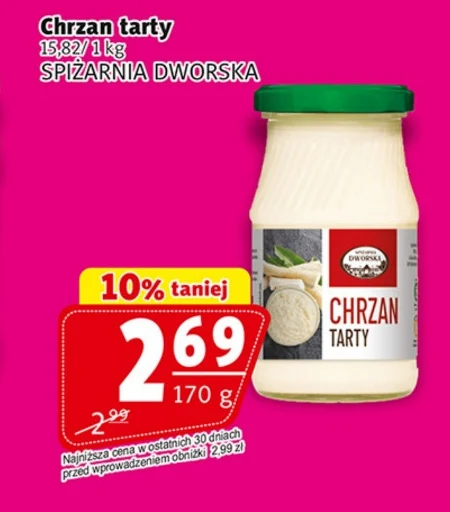 Chrzan tarty występuje w ofercie Prim Market w cenie 15,82 zł za kilogram. Produkt dostępny jest w opakowaniu 269 g w obniżonej cenie, teraz tylko 170 g za 2,99 zł (zamiast 2,99 zł). To tradycyjny dodatek do mięs, szczególnie wieprzowiny, jaj oraz wędlin, doskonale wzbogacający smak potraw. Sprawdzi się jako składnik sosów, marynat oraz past kanapkowych. Obniżka czyni ten produkt wyjątkowo atrakcyjnym wyborem, pozwalając na zaoszczędzenie przy zakupie ulubionego dodatku do posiłków. To okazja, której warto nie przegapić.