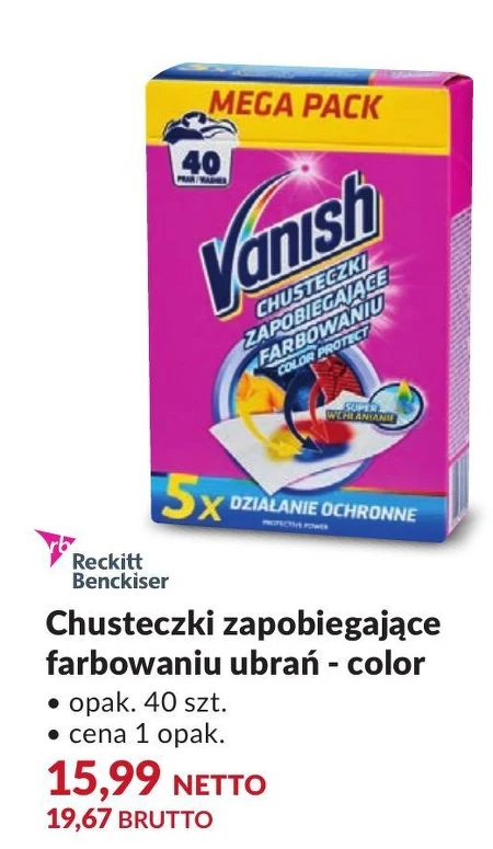 Vanish CHUSTECZKI ZAPOBIEGAJĄCE FARBOWANIU COLOR PROTECT opak. 40 szt. • cena 1 opak. 15,99 NETTO 19,67 BRUTTO .