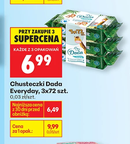 Ofercie handlowej Biedronka znajdziesz chusteczki Dada Everyday, 3 opakowania po 72 sztuki każde, w cenie 6,99 zł, co daje 0,03 zł za sztukę. To ekonomiczny wybór dla każdego gospodarstwa domowego, a cena za opakowanie to 9,99 zł, czyli 0,05 zł za sztukę. Chusteczki sprawdzą się w codziennej higienie, przydadzą się w domu, w podróży oraz podczas sprzątania. To okazja, by zaopatrzyć się w niezbędny produkt w supercenie, ponieważ najniższa cena z ostatnich 30 dni przed obniżką wynosiła 6,49 zł.