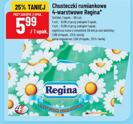 Chusteczki rumiankowe 4-warstwowe Regina* Sofidel, 1 opak. - 96 szt. 1 szt. - 0,06 zł przy zakupie 2 opak. 1 szt. - 0,08 zł przy zakupie 1 opak. najniższa cena z ostatnich 30 dni przed obniżką: 7,99 zł/opak., 25% taniej cena regularna: 7,99 zł/opak., 25% taniej