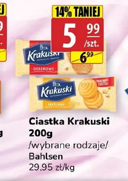 Ciastka Krakuski Bahlsen w sklepie Api Market kosztują teraz tylko 5,99 zł za opakowanie 200g, zamiast 6,99 zł. Promocja obejmuje wybrane rodzaje ciast, a cena za kilogram to 29,95 zł. Krakuski idealnie nadają się do popołudniowej kawy lub jako słodka przekąska w pracy. Sprawdź aktualną gazetkę Ara i zaopatrz się w swoje ulubione ciastka w atrakcyjnej cenie.