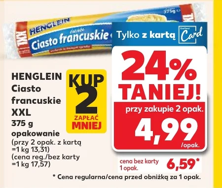 HENGLEIN Ciasto francuskie XXL 375 g opakowanie Idealne do przygotowania wykwintnych quiche, ciasto francuskie XXL od Henglein sprawdzi się również doskonale jako podstawowy składnik przyrządzania klasycznych ciasteczek. Dzięki swojej lekkiej i chrupiącej strukturze, można je wykorzystać do stworzenia różnorodnych przystawek, takich jak roladki czy zawijańce, które zachwycą każdego gościa.