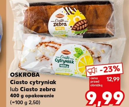 Ciasto cytryniak lub ciasto zebra OSKROBA dostępne jest w ofercie Kaufland w cenie 9,99 za opakowanie 400 g, co daje 2,50 za 100 g. Cena regularna tego ciasta została obniżona z 12,99. To idealna propozycja na szybką przekąskę do kawy lub herbaty, a także słodki dodatek do rodzinnego podwieczorku. Wyróżnia się smakiem i jest pakowane w wygodne opakowanie, dzięki czemu zachowuje świeżość na dłużej. Warto skorzystać z tej okazji, aby zaoszczędzić na ulubionym cieście. Źródło: gazetka Kaufland