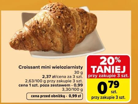 Croissant mini wieloziarnisty 30 g 2,37 zł/cena za 3 szt. 2,63/100 g przy zakupie 3 szt. cena 1 szt. poza zestawem - 0,99 3,30/100 g cena przed obniżką - 0,99 zł