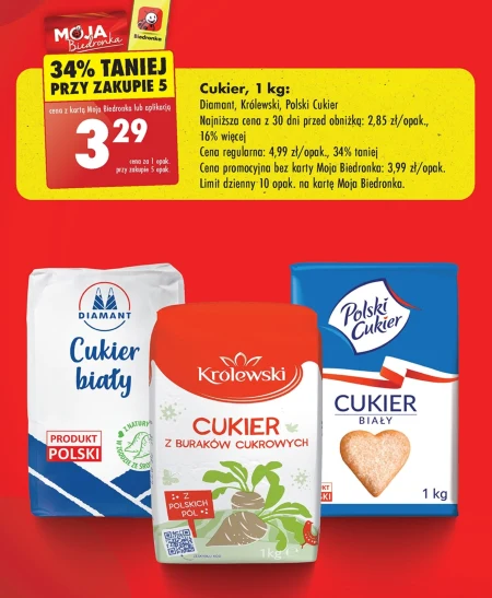 Cukier, 1 kg: Diamant, Królewski, Polski Cukier Najniższa cena z 30 dni przed obniżką: 2,85 zł/opak., 16% więcej Cena regularna: 4,99 zł/opak., 34% taniej Cena promocyjna bez karty Moja Biedronka: 3,99 zł/opak. Limit dzienny- 10 opak. na kartę Moja Biedronka.