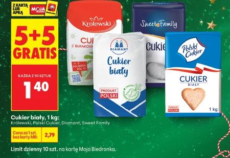 Cukier biały, 1 kg: Królewski, Polski Cukier, Diamant, Sweet Family Cena za 1 szt. bez karty MB: 2,79 Limit dzienny 10 szt. na kartę Moja Biedronka.