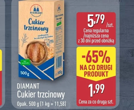 Cukier trzcinowy DIAMANT w opakowaniu 500 g dostępny jest w ofercie Aldi w cenie 5,79 zł za sztukę, z wyjątkową promocją -65% na co drugi produkt, obniżając cenę do 1,99 zł. To naturalny dodatek do napojów, deserów i potraw, idealny do słodzenia herbaty, kawy oraz wykorzystywany w wypiekach. Aktualna cena jest najkorzystniejsza w ciągu ostatnich 30 dni, co sprawia, że to doskonała okazja, aby zaopatrzyć się w ten produkt. Oferta ważna od 2026-04-13 do 2026-04-18 Źródło: gazetka Aldi