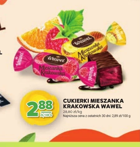 CUKIERKI MIESZANKA KRAKOWSKA WAWEL 28,80 zł/kg Najniższa cena z ostatnich 30 dni: 2,89 zł/100 g Mieszanka cukierków Krakowska Wawel to doskonały wybór na słodką przekąskę dla całej rodziny, idealna na imprezy i spotkania towarzyskie. Można wykorzystać je jako smaczną dekorację tortów lub ciast, dodając im wyjątkowego uroku i koloru.