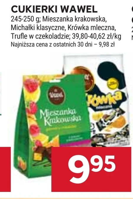 Cukierki Wawel są dostępne w ofercie Stokrotka w cenie 9,95 zł za opakowanie o wadze 245-250 g. To mieszanka krakowska, zawierająca klasyczne Michałki, Krówkę mleczną oraz trufle w czekoladzie. Doskonałe na słodki upominek lub jako dodatek do kawy, te cukierki to idealny sposób na chwilę przyjemności. Aktualna cena jest najniższa z ostatnich 30 dni, więc warto skorzystać z tej okazji i zaopatrzyć się w ulubione smakołyki.