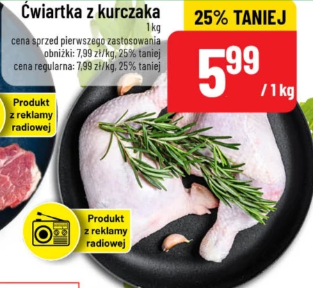 Ćwiartka z kurczaka 1 kg cena sprzed pierwszego zastosowania obniżki: 7,99 zł/kg, 25% taniej cena regularna: 7,99 zł/kg, 25% taniej