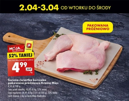 Świeża ćwiartka kurczaka pakowana próżniowo Kraina Mięs 0,50 zł/100 g Cena przed obniżką: 10,49 zł/kg, 52% mniej. Ceno regulama: 10,49 zł/kg (1,05 zł/100 g), 52% taniej Limit dzienny 3 kg na kartę Moja Biedronka.