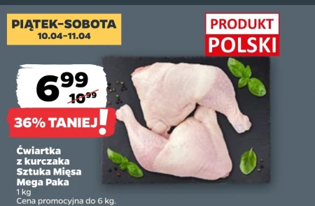 Ćwiartka z kurczaka Sztuka Mięsa dostępna jest w ofercie Netto w cenie 6,99 za kilogram, po obniżce z 10,99, co stanowi 36% taniej. Mega Paka o wadze 1 kg to doskonały wybór dla osób planujących przygotowanie większej ilości potraw z kurczaka. Produkt ten idealnie nadaje się do pieczenia, smażenia, grillowania oraz przygotowywania wywarów, a także jako baza do wielu innych dań. Promocja obowiązuje w Piątek i Sobotę, 10.04-11.04, warto więc skorzystać z tej okazji i zaopatrzyć się w wysokiej jakości mięso w atrakcyjnej cenie. Oferta ważna od 2026-04-10 do 2026-05-11 Źródło: gazetka Netto