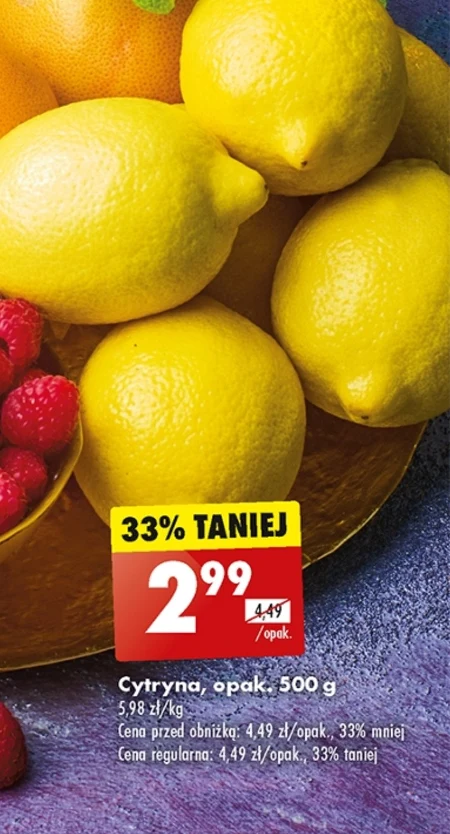 Cytryna, opak. 500 g 5,98 zł/kg Cena przed obniżką: 4,49 zł/opak., 33% mniej Cena regularna: 4,49 zł/opak., 33% taniej