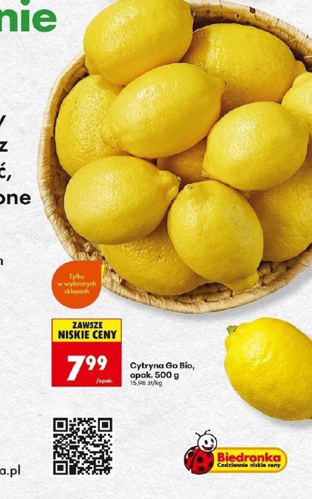 Cytryna Go Bio o wadze 500 g kosztuje 7,99 zł za opakowanie, co daje cenę 15,98 zł za kg i produkt ten występuje w ofercie Biedronka. Te ekologiczne owoce cytrusowe są idealnym wyborem dla osób dbających o naturalne pochodzenie kupnych produktów. Warto zwrócić uwagę, że oferta jest dostępna tylko w wybranych sklepach sieci. To dobra okazja, aby zaopatrzyć się w zdrowe składniki w niskiej cenie. Oferta ważna od 2026-04-07 do 2026-04-11 Źródło: gazetka Biedronka