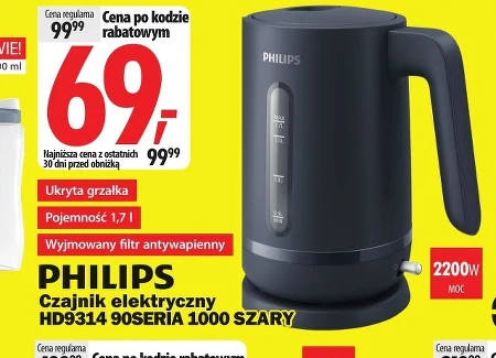 PHILIPS Czajnik elektryczny HD9314 90SERIA 1000 SZARY Ukryta grzałka Pojemność 1,7 l Wyjmowany filtr antywapienny
